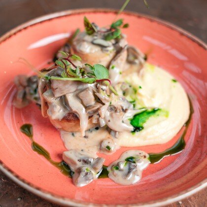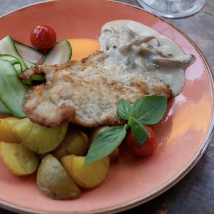 Свиная корейка с жареным картофелем и сливочно-грибным соусом