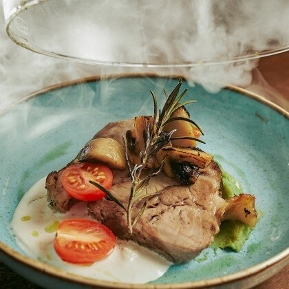 Свиная шея из смокера с пюре из брокколи и сливочным соусом