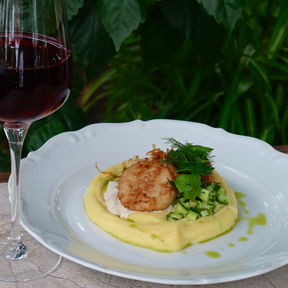 Говяжий язык с жареным картофелем и кремом из шпината