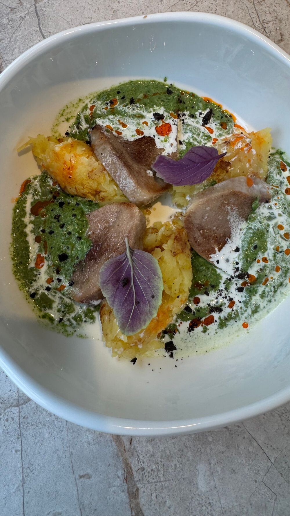 Говяжий язык с жареным картофелем и кремом из шпината