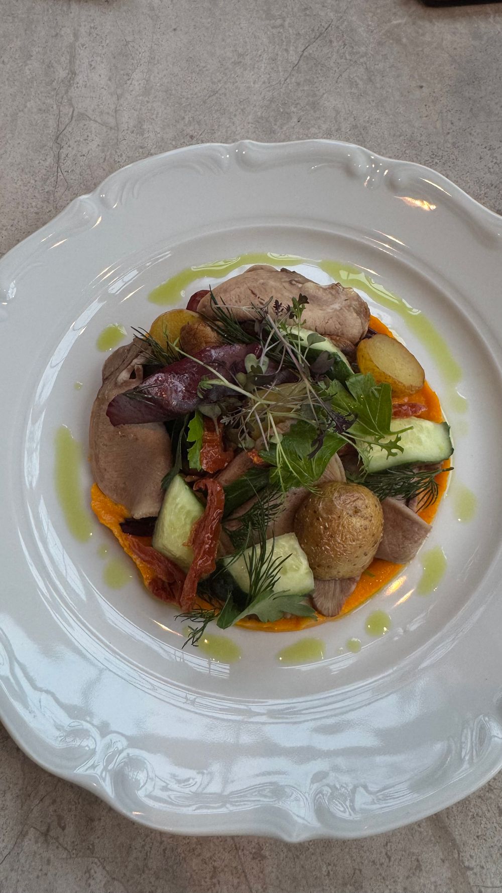 Салат с говяжьим языком и кремом из печеной моркови