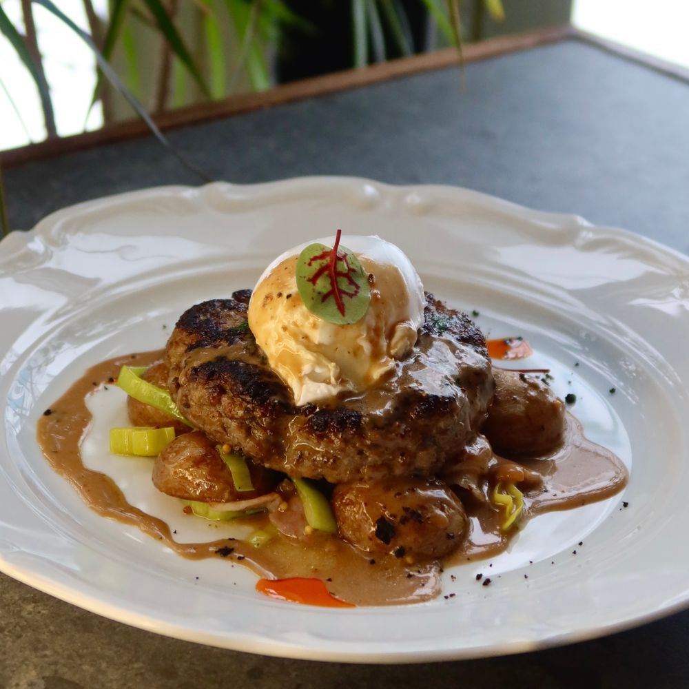 Говяжий язык с жареным картофелем и кремом из шпината